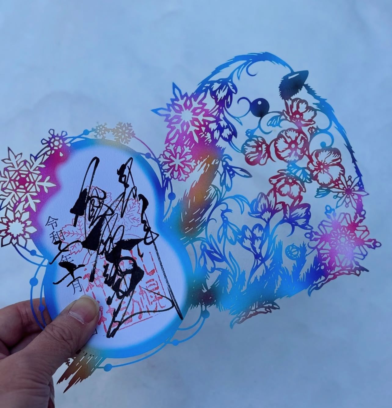 シマエナガと雪だるまの形をした切り絵